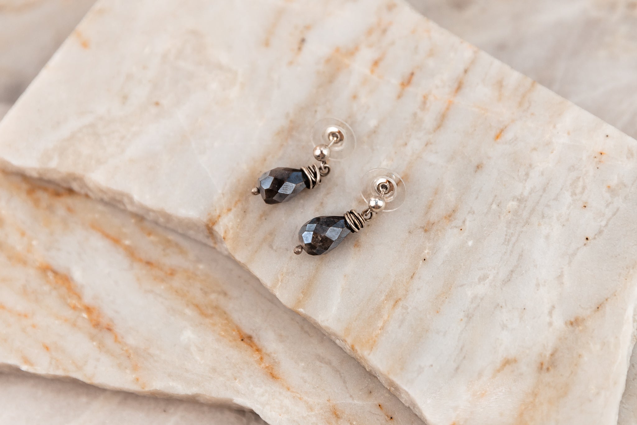 • Handcrafted earrings featuring faceted labradorite teardrops