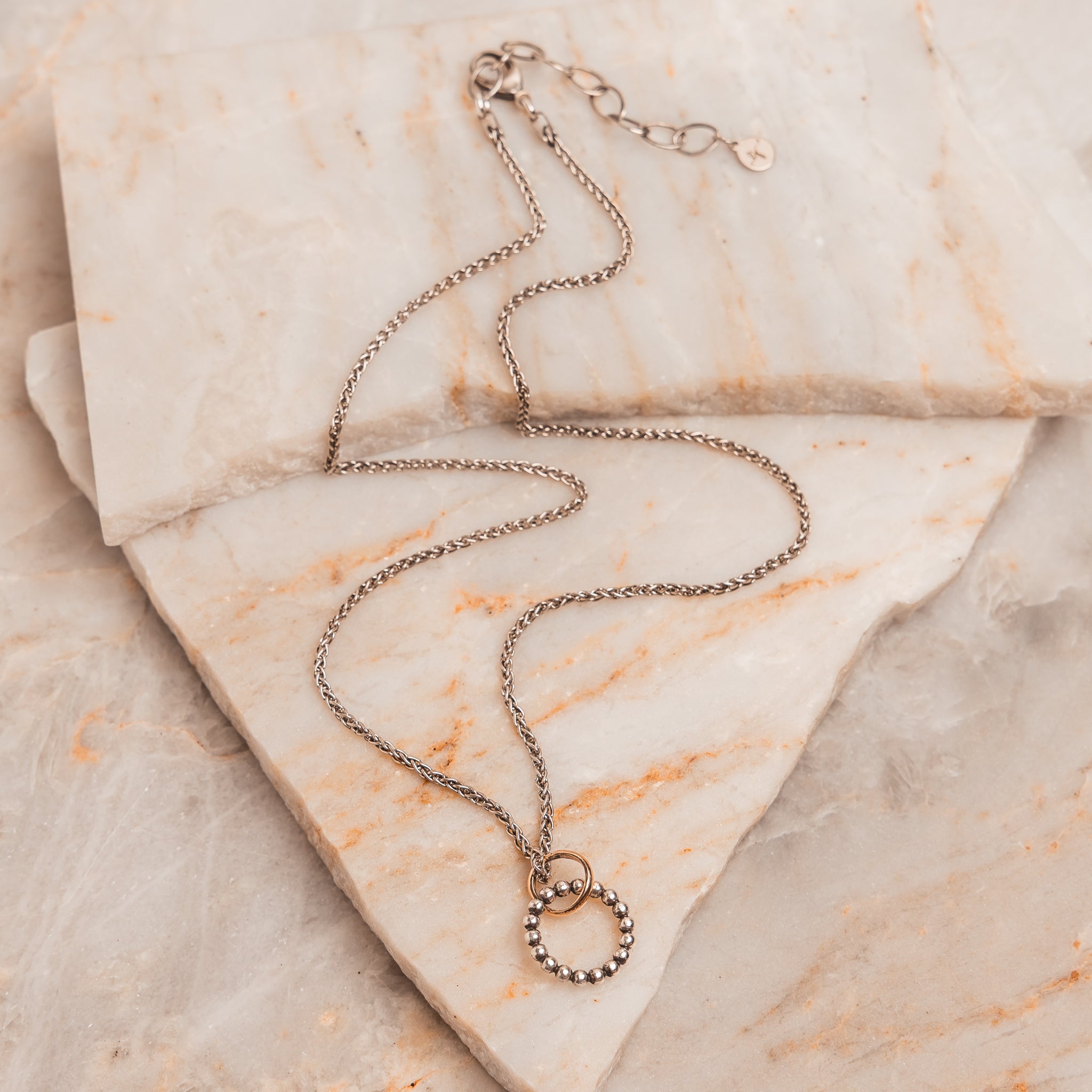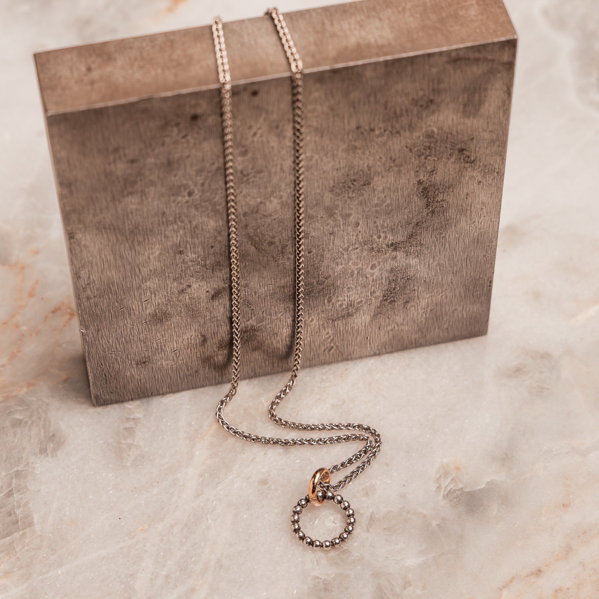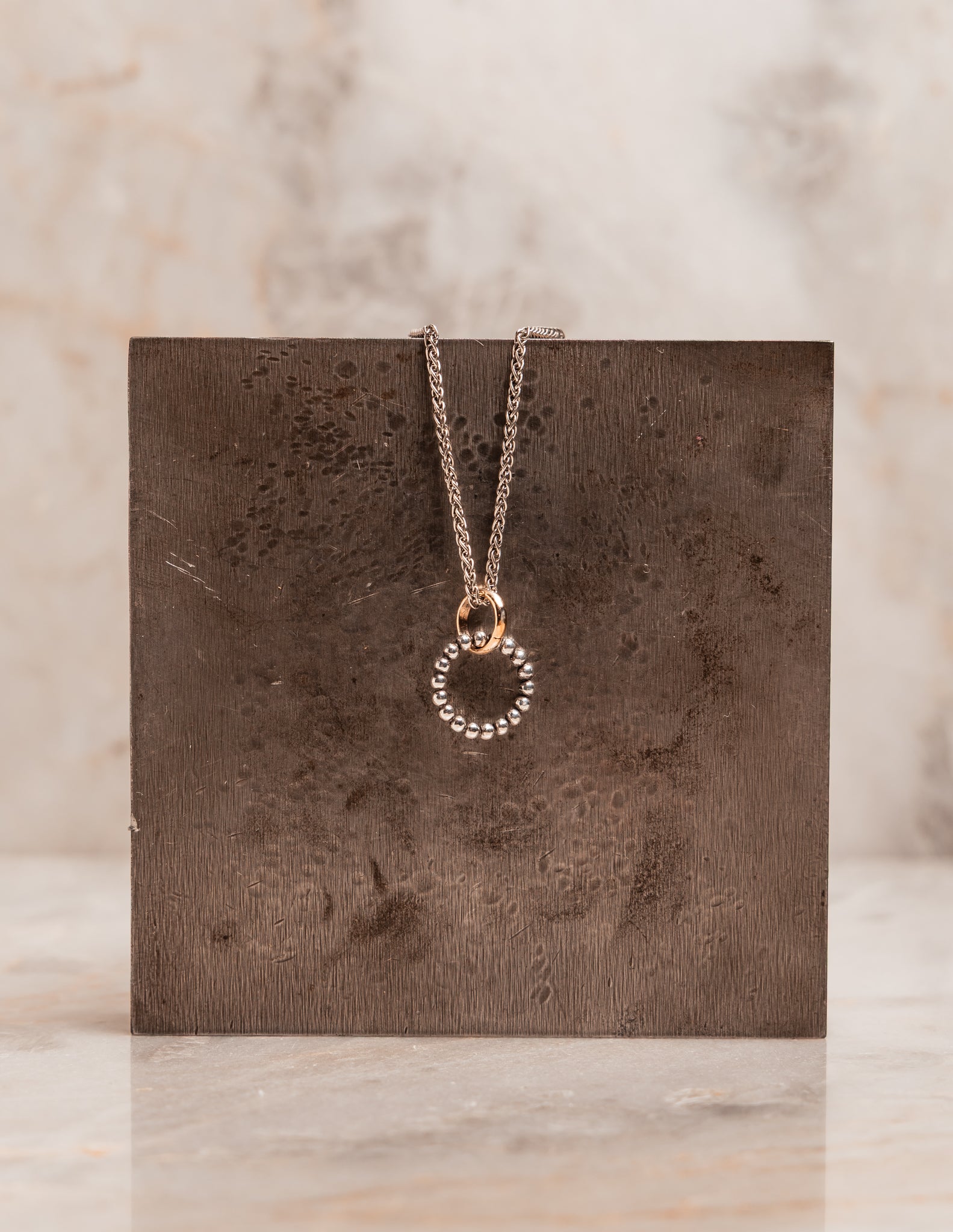 The Blair Necklace is a modern classic designed for everyday elegance. Handcrafted with a timeless mix of sterling silver and gold-filled accents, this necklace features a delicate beaded circle pendant—approximately ¾ " in diameter—suspended from a smooth gold-filled ring. The entire pendant hangs about 1" for the perfect subtle statement.