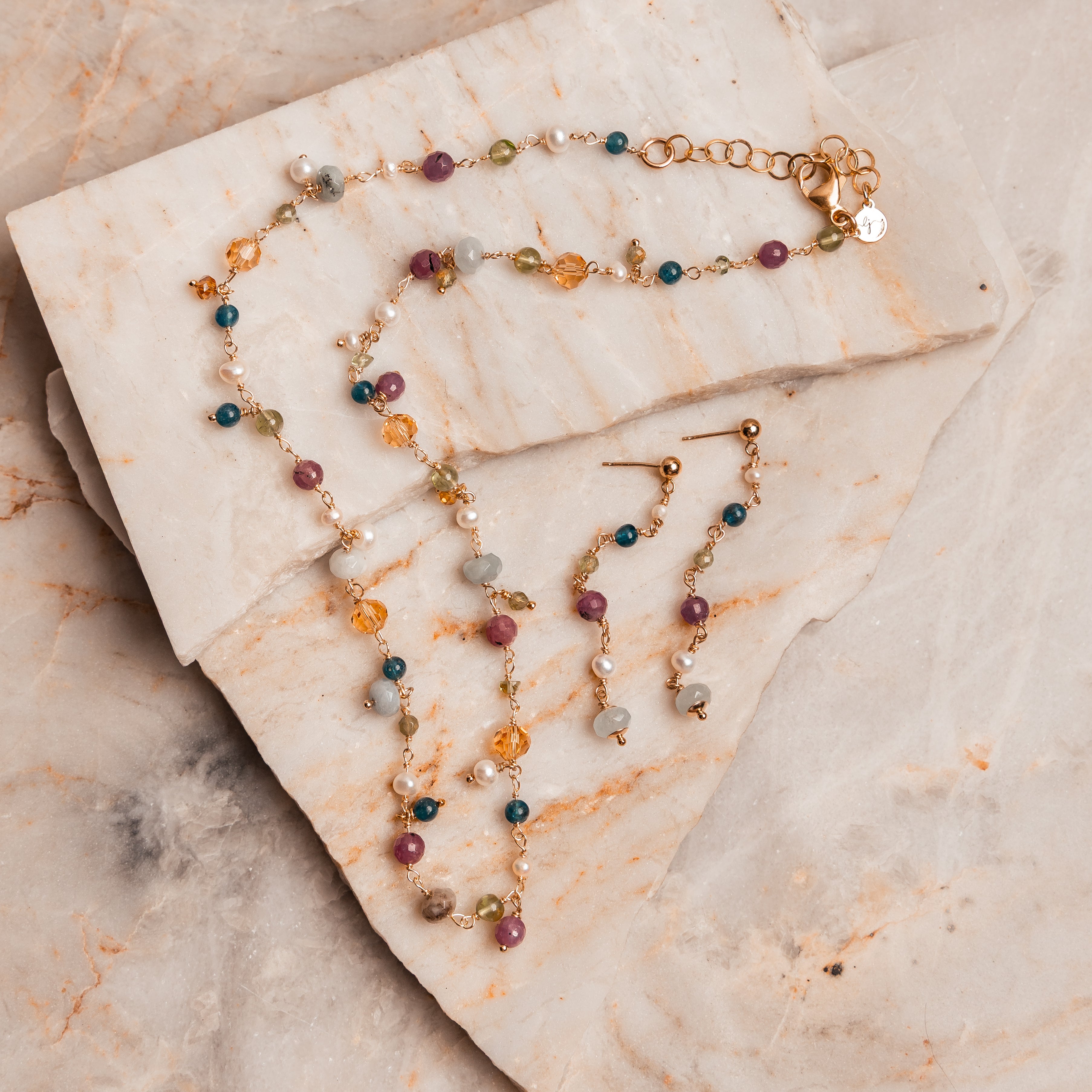 The Felicity Earrings are a joyful cascade of color and elegance, designed to pair perfectly with the Felicity Necklace or shine beautifully on their own. Faceted gemstones including ruby, aquamarine, pearl, and sodalite are hand wrapped in gold filled wire, creating a design that feels both vibrant and refined.